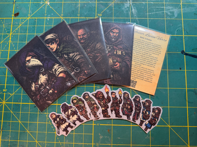 Contained in these files are character cards presenting a character portrait as well as a character description and hook. Also contained are four to six paper standee miniatures. Including some variations and gender swaps.